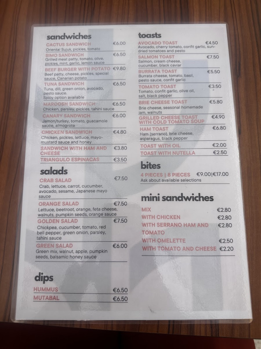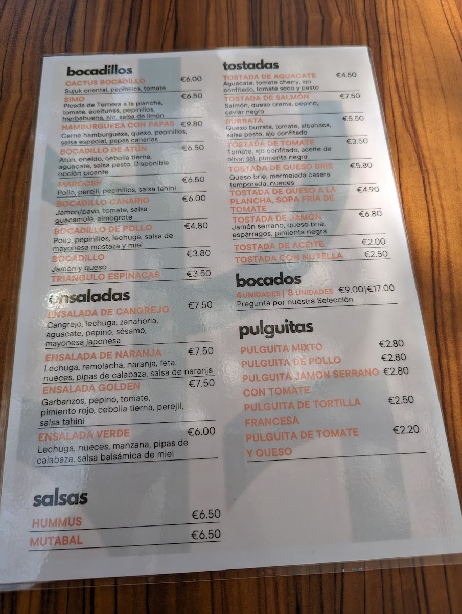 The menu at Cactus Brunch Cafe is organized into several distinct categories, catering to various meal preferences and times of day. It offers a selection of bocadillos, salads, and desserts, making it suitable for breakfast, brunch, light meals, and coffee breaks.